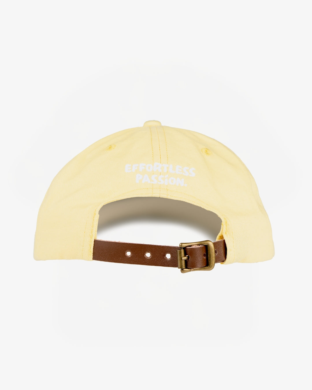 Zacht geel katoen, lichtblauwe borduursels en onze gebogen klaver aan de voorkant.