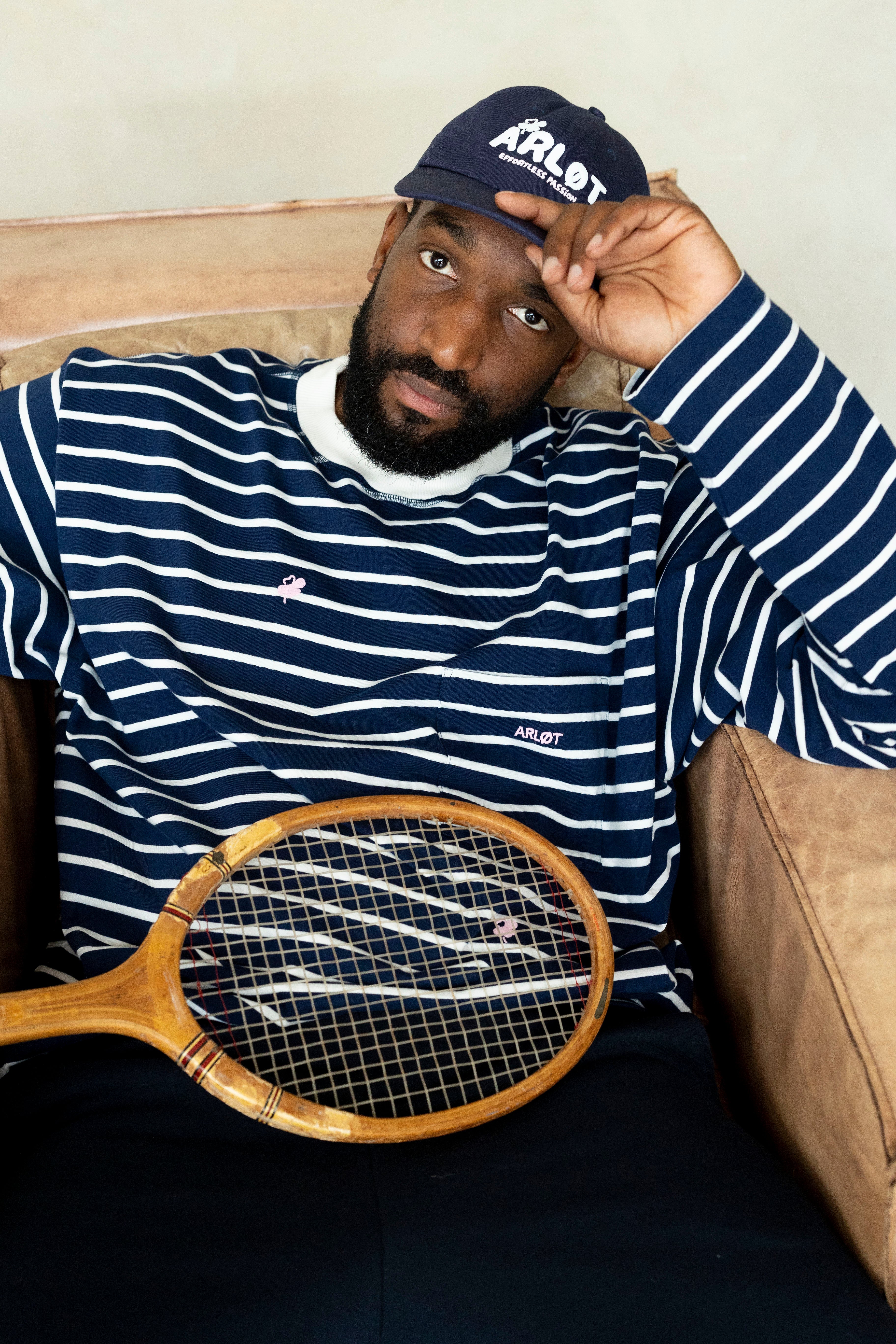 Diepe marineblauwe strepen op stevig premium katoen, ontworpen in onze kenmerkende oversized pasvorm. Een luxueuze basic met karakter: subtiele roze klaverborduursels, een contrasterende ribkraag en een borstzak met ARLØT-signatuur.